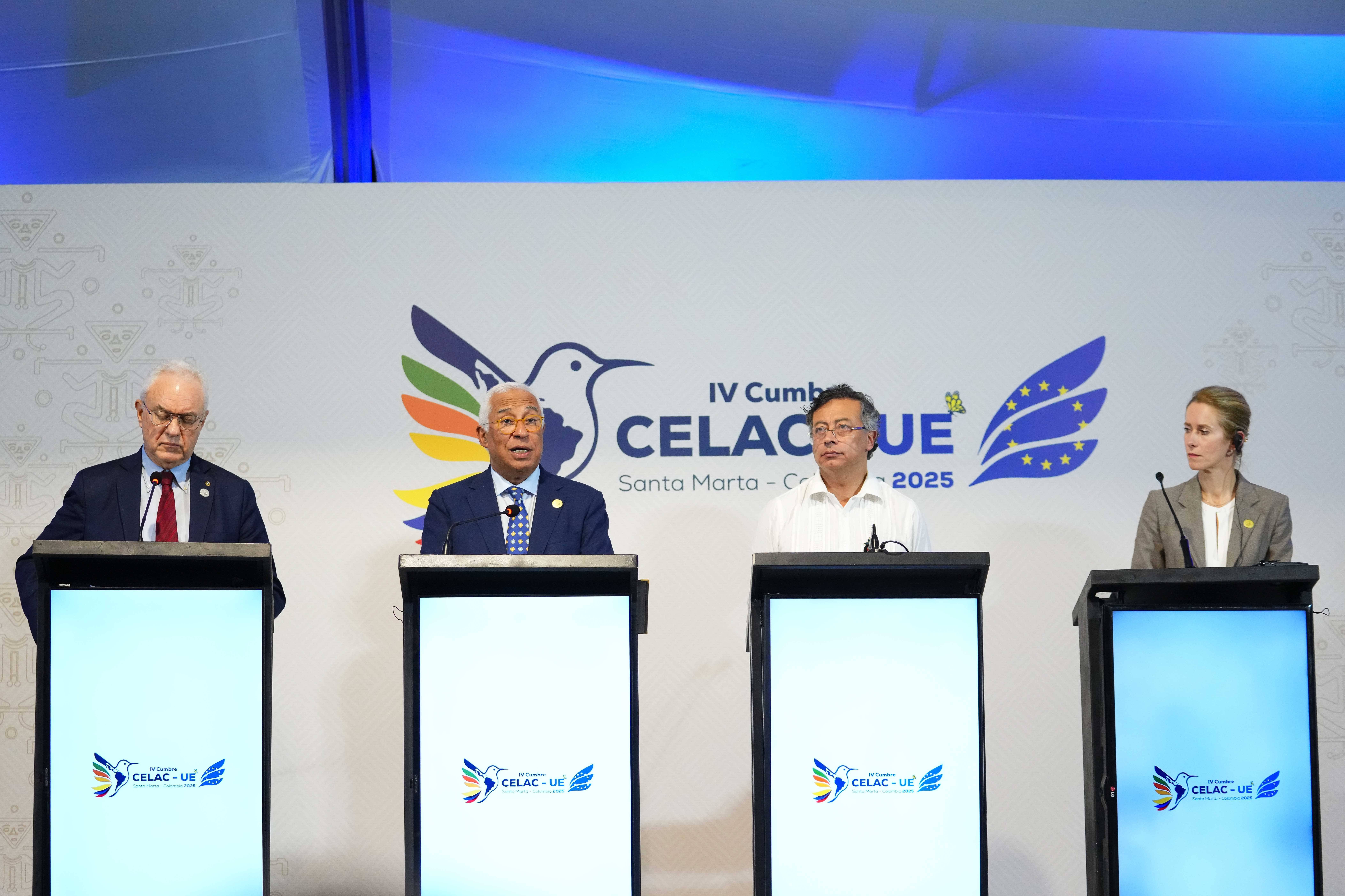 11月9日,拉共体-欧盟峰会联合宣言发布会在圣玛尔塔举行。新华社发(安德烈斯·莫雷诺摄)为期两天的峰会通过联合宣言,重申双方遵守联合国宪章宗旨和原则,特别是各国主权平等、尊重领土完整和政治独立、不干涉他国内政以及和平解决争端,反对以武力相威胁或使用武力。宣言强调双方支持推进哥伦比亚和平进程,讨论了加勒比地区海上安全和区域稳定的重要性。
